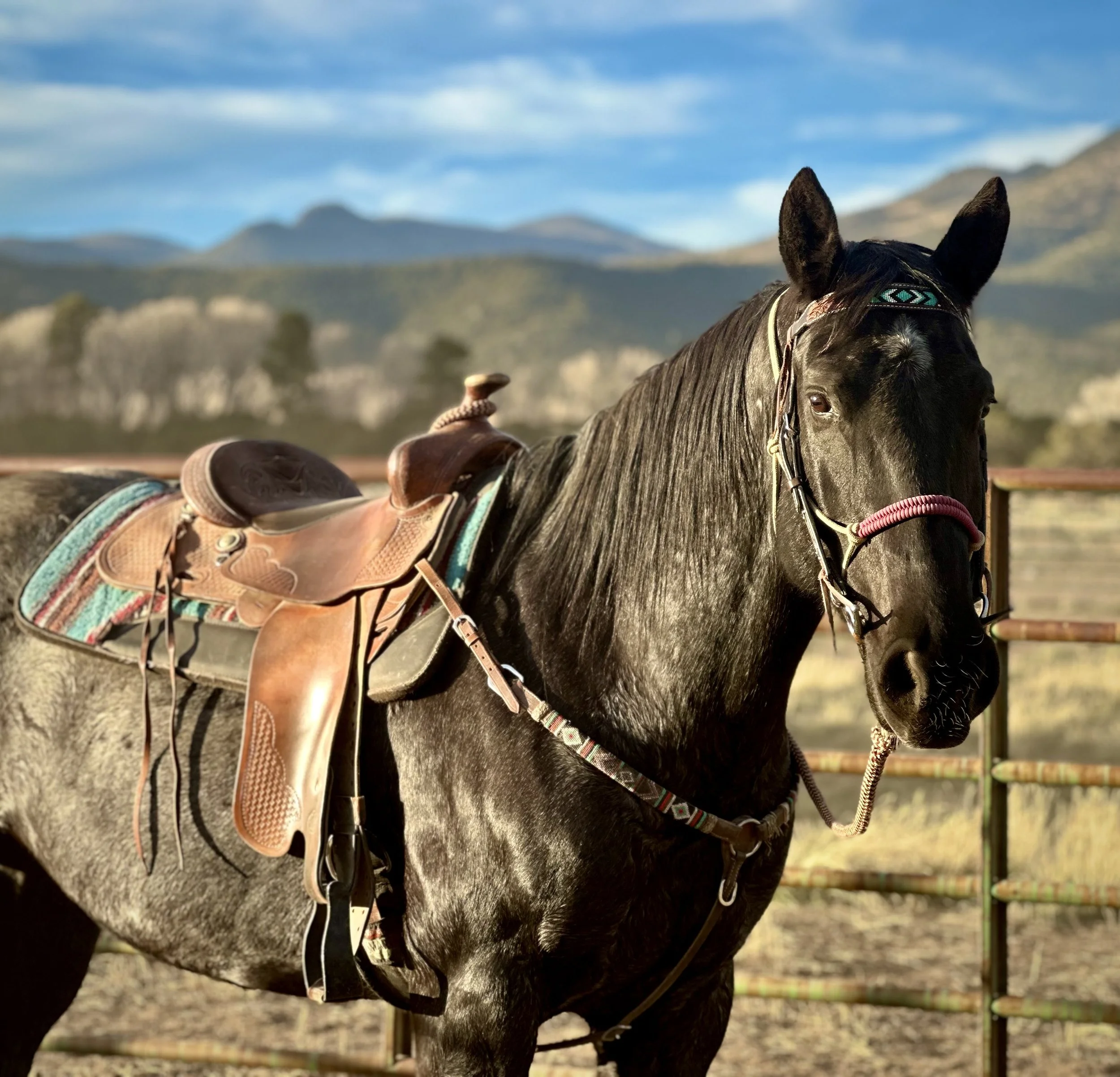 Relic is a stunning 5-year-old blue roan whose owners rescued him and 9 other babies from a low-end auction several years ago. Relic’s loving humans sent him to Second Chance Ranch for him to be started under saddle so that he can find a permanent home in the near future. Relic is extremely sweet on the ground — he is wonderful for the vet and farrier, loads into the trailer like a champ, and loves his “spa days.” Relic is just about ready for his first ride after a month of groundwork — he will be ready for adoption once he’s had 60 days under saddle to an approved home. Reach out if you’d like to learn more about this special boy.